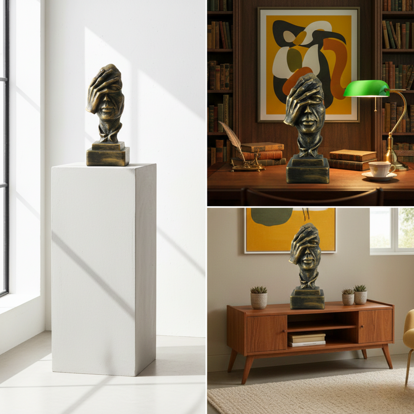 Golden-Black Vintage look Silent Face Sculpture with Hand on Eyes & Ear