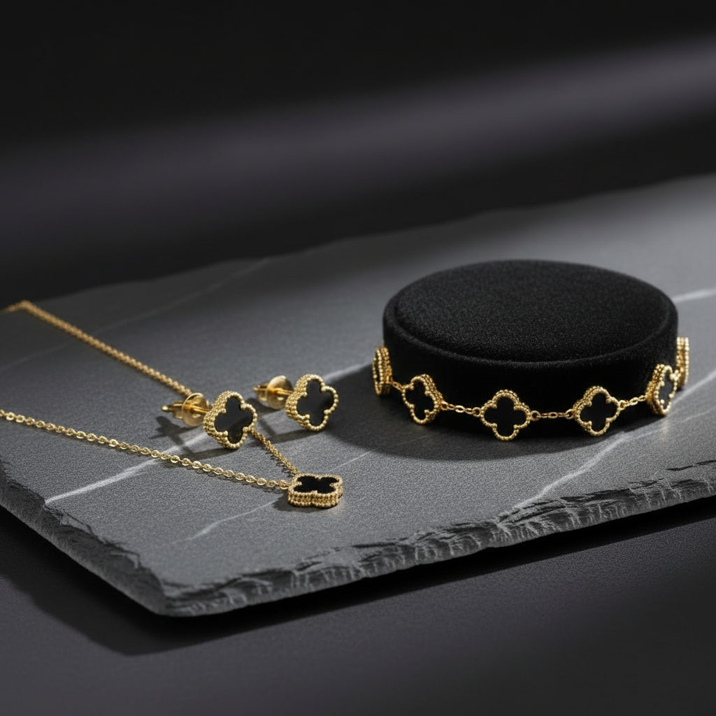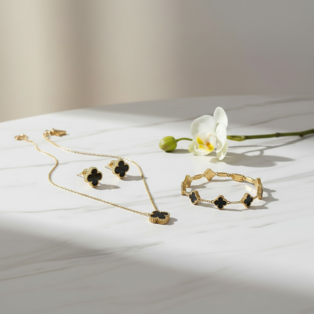 4-Pieces Set of Golden-Black 4 Leaves Clover Locket with Bracelets & Earrings in Gift Packing