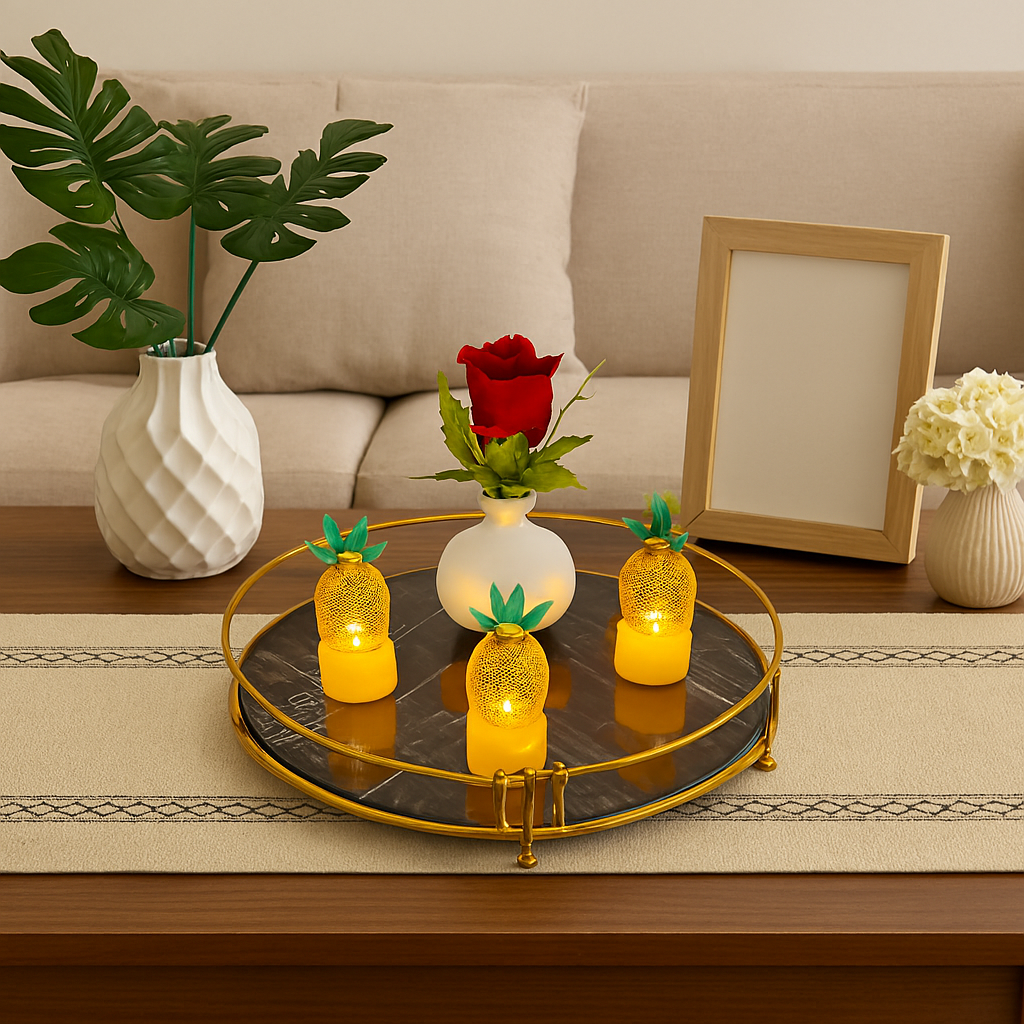 Product Material: Metallic Tray, PVC Platform, Ceramic Vase with Flower, 3 Pineapple LED